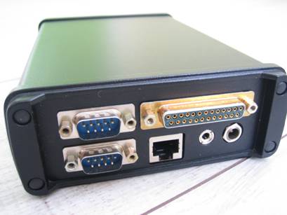 De achterzijde met links 2x RS232, midden onder de LAN-aansluiting en rechts boven een 25 pol.sub-D multi-connector voor aansluiting van VGA, muis en keyboard. |
