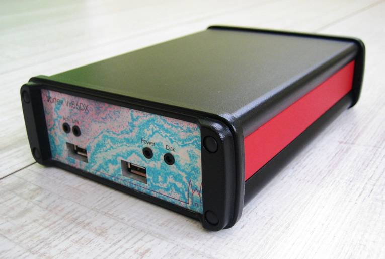De voorzijde van de Vortex mini-pc met twee USB poorten. |